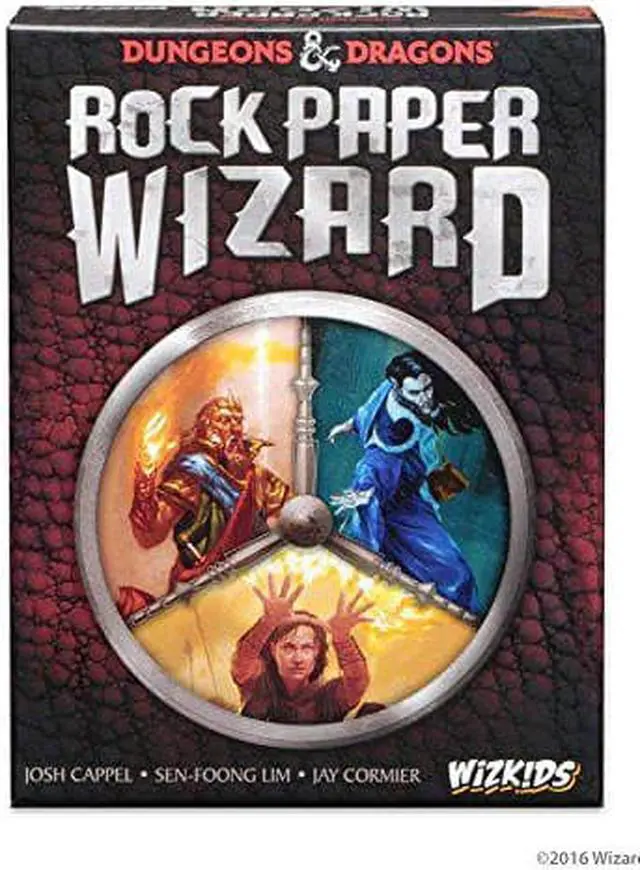 "Cast spells and compete against other wizards in an epic race for loot! Rock Paper Wizard is an exciting party game for 3-6 players! In Rock Paper Wizard each player competes against a powerful wizard! In this brand new Dungeons & Dragons edition of Rock Paper Wizard your adventuring party has just defeated a fiery dragon in a treacherous cave. Now you and your fellow wizards argue over how to distribute the shares of treasure left behind and do what every self respecting wizard does, initiate a spell battle! Choose your wizards spell and cast some magic by repeating one of the hand gestures found on the cards in front of you.