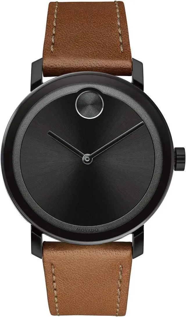Large Movado BOLD Evolution Features a thin 40 mm black ion-plated stainless steel case, K1 crystal, black sunray dial with matching sunray dothands, top-stitched cognac leather strap with black ion-plated stainless steel buckle