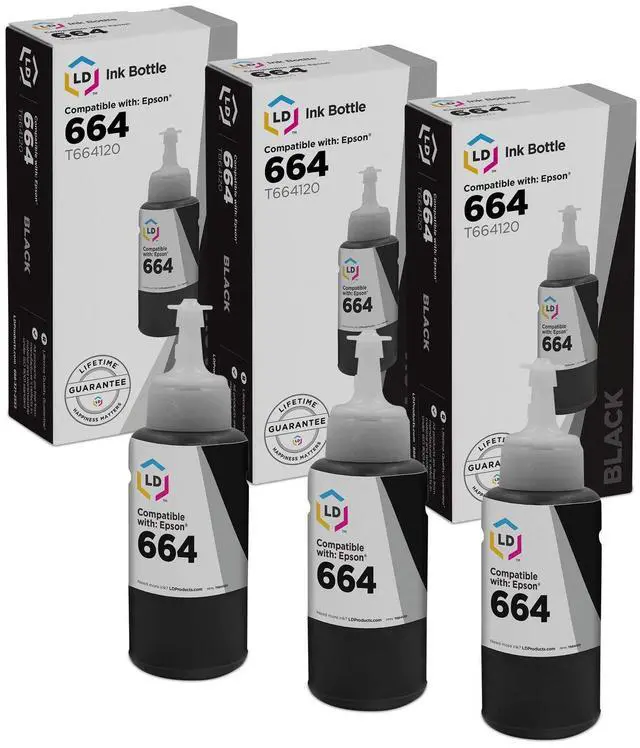 Save even more with our set of 3 remanufactured ink bottles This listing contains 3 T664120 black ink bottles Why pay twice as much for brand name Epson 664 bottle when our remanufactured printer supplies deliver excellent quality for a fraction of the price Our remanufactured bottles for Epson are backed by a 100% satisfaction and LIFETIME guarantee So stock up now and save even more This set is compatible with Expression ET-2500, ET-2550, ET-4500 and Workforce ET-16500, ET-4500, ET-4550 Please note, retail packaging may vary and this item will only work with printers purchased within the United States and canada We are the exclusive reseller of LD Products brand of high quality printing supplies on Amazon