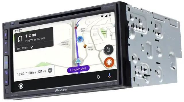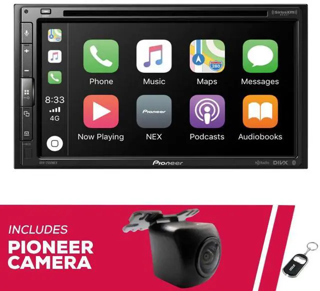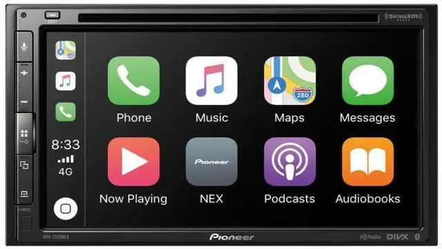 Pioneer AVH-2550NEX DVD Receiver features a double-Din 6.8" WXGA display, compatible with CarPlay and Android Auto (both wired). It offers built-in HD Radio with satellite radio support and Bluetooth connectivity for easy audio streaming and hands-free control.
