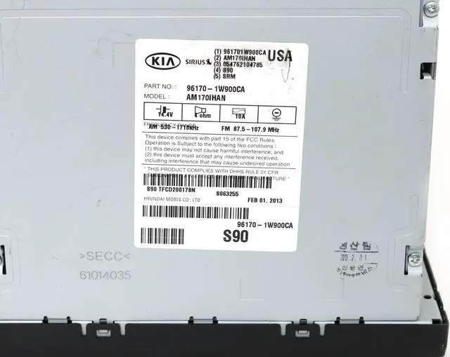 Part Number: 96170-1W900CA. This is for a Kia Rio AM FM Radio mp3 CD player without Navigatin or Bluetooth with Satellite Capabilities. This radio has been professionally remanufactured, cleaned, and serviced as needed and thoroughly checked. The radio has minor wear and scratches on the face, but overall good condition. See pictures for details. This radio is in 100% working order. This radio is being sold as a REPLACEMENT ONLY! The part number is 96170-1W900CA. If you do not have this exact part number currently in your vehicle, it will likely NOT WORK. If you are unsure of your part number, give us a call with your VIN and we should be able to provide you with the correct part number. They may look the same and have the same plugs but data streams may be different, not allowing them to code. For example, external amps are used in some cars and will not allow interchange, etc.