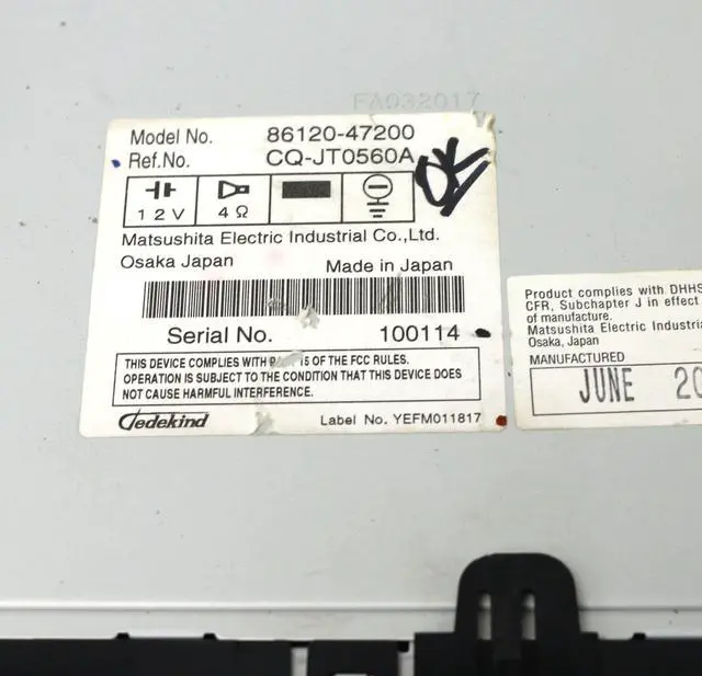 Face Code: 51824. This is for a Toyota Prius AM FM Radio mp3 CD Player. This radio has been cleaned, upgraded, serviced as needed and thoroughly checked. Appearance is good with scratches on the face as pictured, function is perfect! This radio is being sold as a REPLACEMENT ONLY! The part number for this radio is 86120-47200. If you do not have this exact part number currently in your vehicle, it will likely NOT WORK. If you are unsure of your part number, contact us with your VIN and we should be able to provide you with the correct part number. They may look the same and have the same plugs but data streams may be different, not allowing them to code. For example, external amps are used in some cars and will not allow interchange, etc.