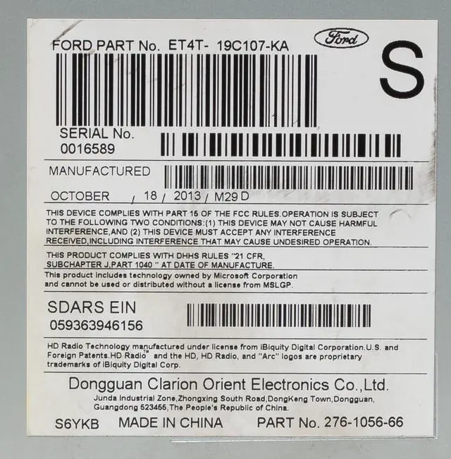 Part Number: ET4T19C107KA. This is for a Ford AM FM Radio MP3 CD Player. This radio has been professionally remanufactured, cleaned, and serviced as needed and thoroughly checked. The radio's appearance is great, as pictured, and is in 100% working order. This radio is being sold as a REPLACEMENT ONLY! The part number is ET4T19C107KA. If you do not have this exact part number currently in your vehicle, it will likely NOT WORK. If you are unsure of your part number, give us a call with your VIN and we should be able to provide you with the correct part number. They may look the same and have the same plugs but data streams may be different, not allowing them to code. For example, external amps are used in some cars and will not allow interchange, etc.