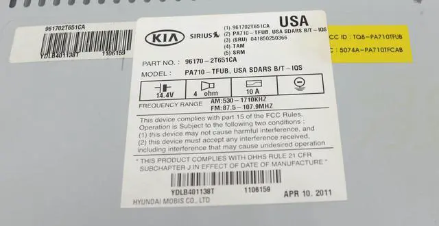 Model: PA710-TFUB This is for a Kia Optima AM FM Radio mp3 Single Disc CD Player w Satellite Capability. This radio has been professionally remanufactured, cleaned, serviced as needed and thoroughly checked. The radio's appearance is decent as pictured. This radio is in 100% working order. This radio is being sold as a REPLACEMENT ONLY! The part number is 96170-2T651CA. If you do not have this exact part number currently in your vehicle, it will likely NOT WORK. If you are unsure of your part number, contact us with your VIN and we should be able to provide you with the correct part number. They may look the same and have the same plugs but data streams may be different, not allowing them to code. For example, external amps are used in some cars and will not allow interchange, etc.