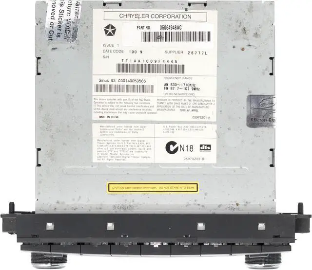 This unit is being sold as a REPLACEMENT ONLY! The part number is 05064948AC. If you do not have this exact part number, or compatible part number currently in your vehicle, it will likely NOT WORK. If you are unsure of your part number, contact us with your VIN and they should be able to provide you with the correct part number. They may look the same and have the same plugs but data streams may be different, not allowing them to code. For example, external amps are used in some cars and will not allow interchange, etc.
