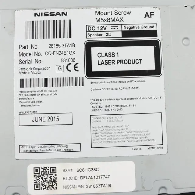 Model: CQ-FN24E1GX This is for a Nissan Altima AM FM XM Radio mp3 Single Disc CD Player w Bluetooth Capability. This radio has been professionally remanufactured, cleaned, and serviced as needed and thoroughly checked. The radio is in decent cosmetic condition with minor wear as seen in pictures. This radio is in 100% working order. The part number is 28185-3TA1B. If you do not have this exact part number currently in your vehicle, it will likely NOT WORK. If you are unsure of your part number, contact us with your VIN and we should be able to provide you with the correct part number. They may look the same and have the same plugs but data streams may be different, not allowing them to code. For example, external amps are used in some cars and will not allow interchange, etc.