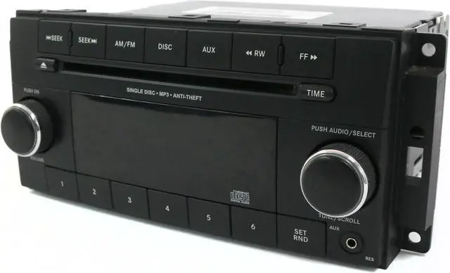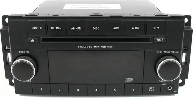 Face: RES. Code Included. Minor Wear and Scratches. This is for a Chrysler Dodge Jeep AM FM Radio mp3 Single Disc CD Player w Aux mp3 Ready. This radio has been cleaned, serviced as needed and thoroughly checked. Appearance is decent with minor wear and scratches as pictured. Function is perfect! This radio is being sold as a REPLACEMENT ONLY! The part number is P05091195AB. If you do not have this exact part number currently in your vehicle, it will likely NOT WORK. If you are unsure of your part number, contact us with your VIN and we should be able to provide you with the correct part number. They may look the same and have the same plugs but data streams may be different, not allowing them to code. For example, external amps are used in some cars and will not allow interchange, etc.