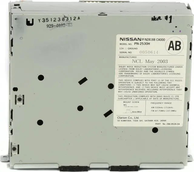 Interchange Part Number: 638-58252 AM FM Radio 6 Disc CD Player. This is for a professionally remanufactured 2003 Nissan AM FM Radio 6 Disc CD Player. This radio has been cleaned, serviced as needed and thoroughly checked. The item is in decent cosmetic condition with minor wear throughout the face as pictured. Function is in 100% working order! This unit is being sold as a REPLACEMENT ONLY! The part number is 28688CA000. If you do not have this exact part number currently in your vehicle, it will likely NOT WORK. If you are unsure of your part number, contact us with your VIN and they should be able to provide you with the correct part number. They may look the same and have the same plugs but data streams may be different, not allowing them to code. For example, external amps are used in some cars and will not allow interchange, etc.