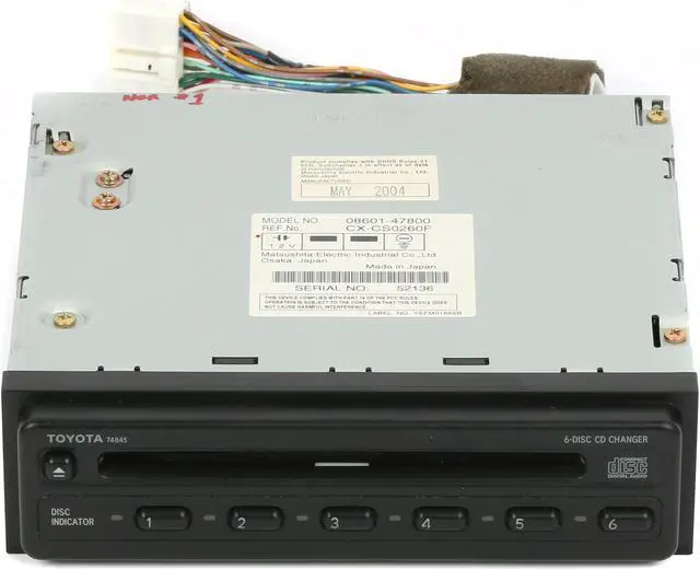 Reference Number: CX-CS0260F. This is a professionally remanufactured 2004-2005 Toyota Prius 6 Disc CD Player. This CD player has been cleaned, serviced as needed, and thoroughly checked. The appearance of this CD player is in decent condition with minor wear as pictured. The function is perfect! This CD Player is being sold as a REPLACEMENT ONLY! The part number is 08601-47800. If you do not have this exact part number or compatible part number currently in your vehicle, it will likely NOT WORK. If you are unsure of your part number, give a dealer a call with your VIN and they should be able to provide you with the correct part number. They may look the same and have the same plugs but data streams may be different, not allowing them to code. For example, external amps are used in some cars and will not allow interchange, etc.