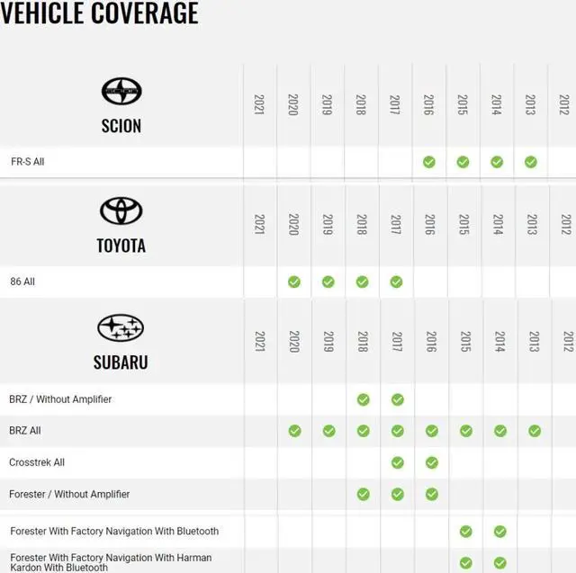 - Allows installation of a new aftermarket receiver in select Subaru, Scion, and Toyota vehicles
