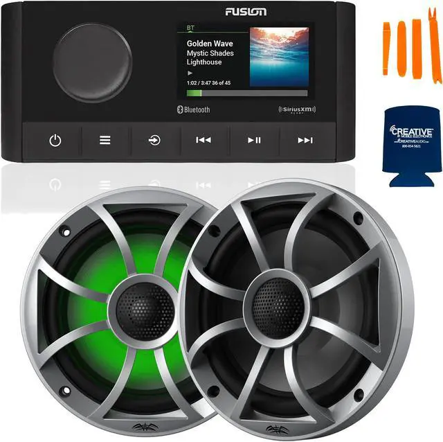 Fusion MS-RA210 Marine AM/FM/BT/NEMA2000/Sirius XM Ready Stereo with 1 Pair Wet Sounds RECON6-S-RGB High Output 6.5" RGB Lighting Marine Coaxial Speakers, Silver Grill - This bundle includes a Fusion MS-RA210 Marine Entertainment System With Bluetooth & DSP, AM/FM, Sirius XM Ready, a pair of Wet Sounds RECON6-S-RGB LED 6.5" 60-Watt RMS Coaxial Speakers With Silver XS Grilles, a pry kit, and a Creative audio coozy.