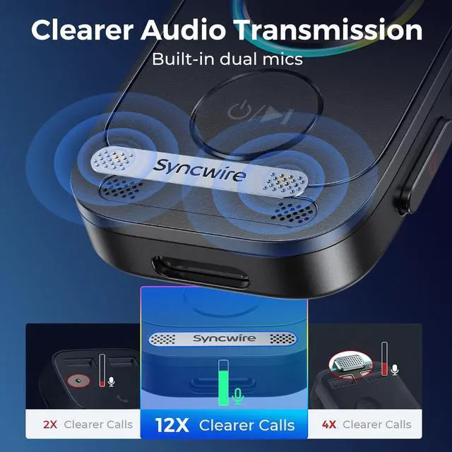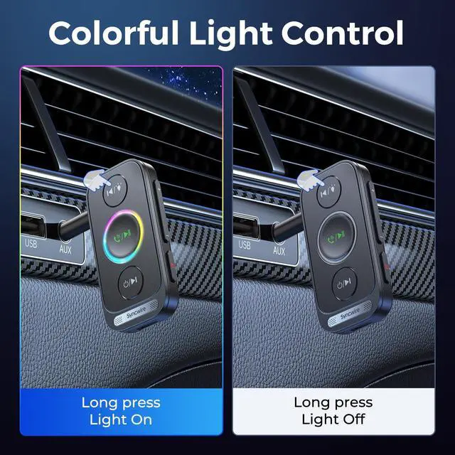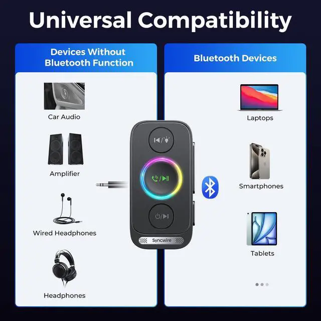 Syncwire Bluetooth 5.4 Aux Adapter for Car, Bluetooth 3.5mm Aux Receiver Wireless Audio Receiver for Home Stereo, Wired Headphone, Hands-Free Call, 22H Battery, Deep Bass, Colorful Light, Black