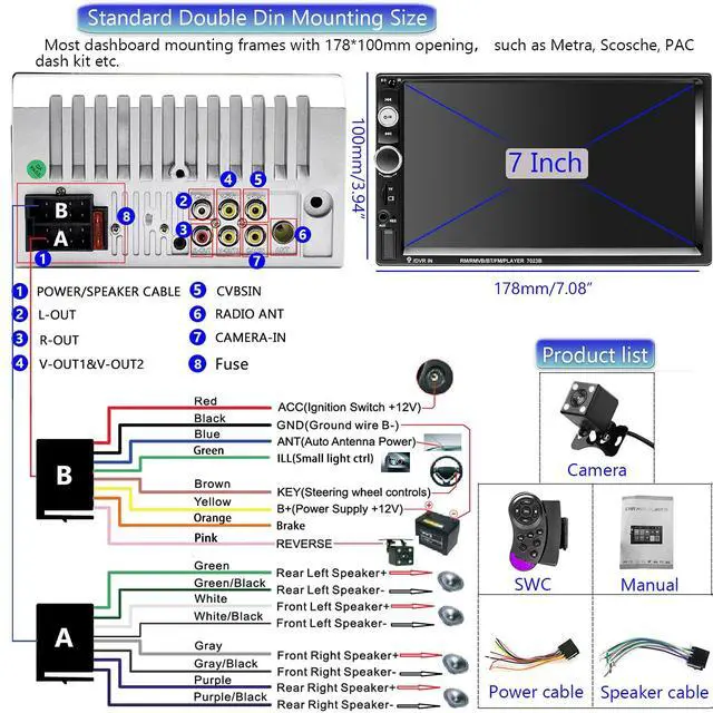 • HD Touchscreen Car Radio: 7 inch TFT HD Digital Multi-color touch screen, 800 x 480 screen resolution, support 1080P video playback, give you a fantastic experience. Come with a back up camera and a steering wheel control, help your driving and parking safer and more convenient