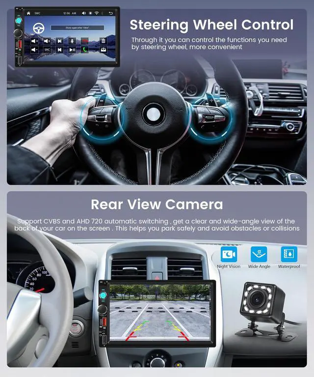 - SWC & Backup Camera: This double din CarPlay car stereo is compatible with your vehicles original steering wheel control (SWC). You can easily adjust volume, switch music tracks and manage calls without taking hands off the wheeleffectively enhancing driving safety. Equipped with AHD backup camera, it provides a clear rear view when reversing, helping you avoid obstacles and park safely, eliminating parking blind spots