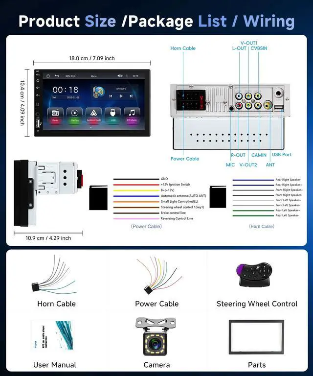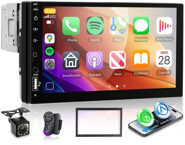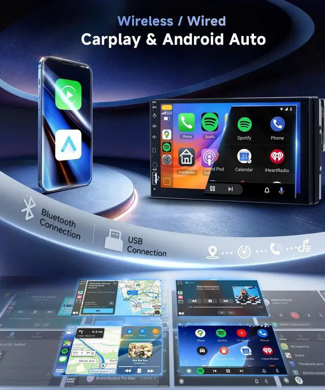 Wireless/Wired Carplay & Wireless/Wired Android Auto This single din car stereo can choose a wireless or wireless connection to CarPlay or Android Auto, connect to an iOS mobile phone, access the address book of the mobile phone, email phone, notifications, card navigation, music, videos and other information. The Android Auto can use the Android phone of the user to the address book of the mobile phone, music, voice control, etc.