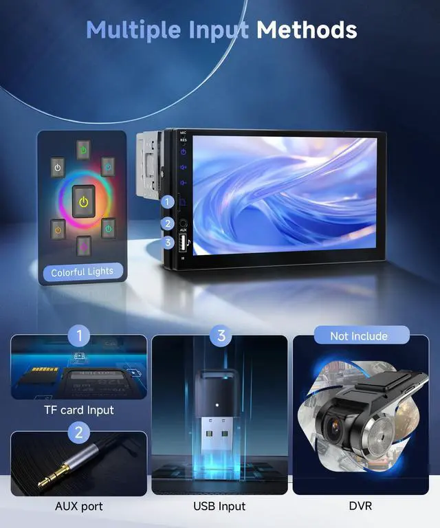 7 Inch IPS Touchscreen Single Din Car Stereo The installation road of the universal 1 DIN car radio: 178 mm * 50 mm * 109mm. This car radio 1 Din with 7 inch HD LCD touchscreen. Supports USB/DVR/AUX inputs to which you can connect your devices and enjoy your favorite music, videos and photos, and you can also use the USB connection to charge your phone while driving. Supports the EQ function and offers personalized audio settings for a high-quality music experience. Car radio with seven colored lights, you can choose your favorite color. The car radio comes with a square frame, which can make the car radio fit better with your center console.