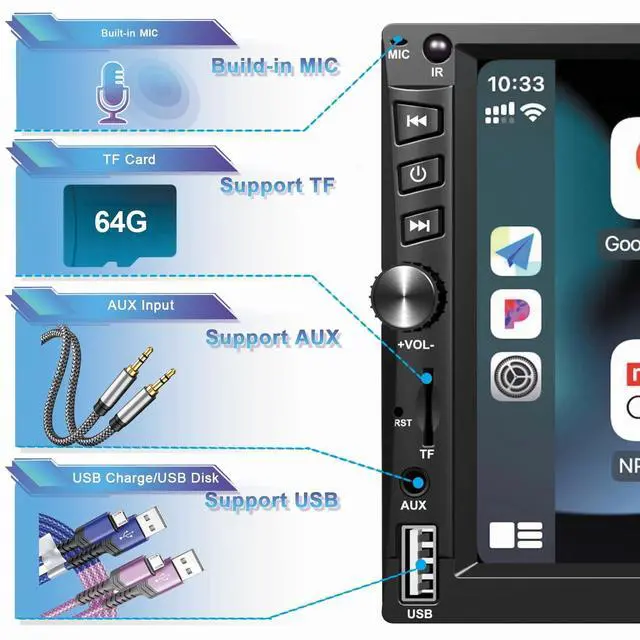 Wireless CarPlay, Android Auto, Built-In Bluetooth, IPS Touchscreen, FM Tuner, Bluetooth, Auxiliary, USB