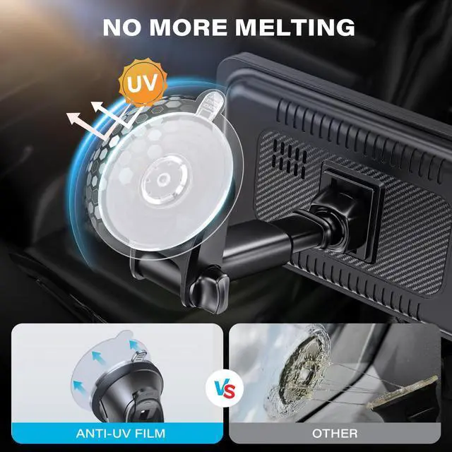 Clean the windshield surface, apply the ANTI-UV film, remove any bubbles, and then attach the suction cup mount.
