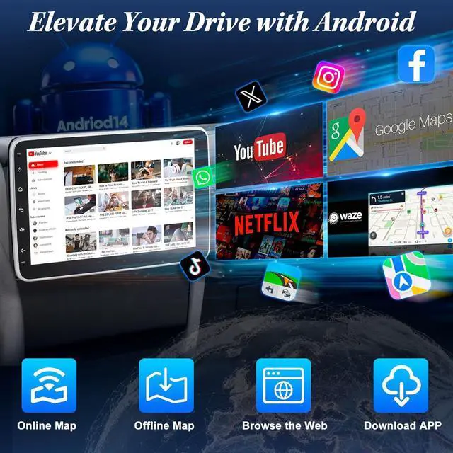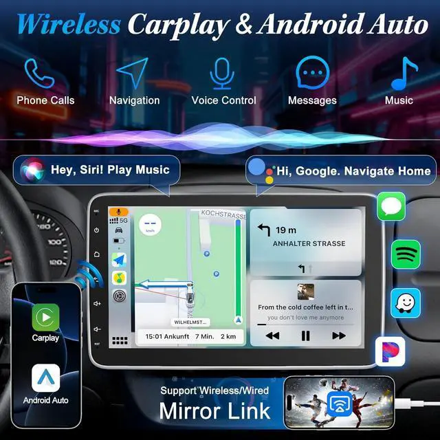 Apple CarPlay & Android Auto with Voice Control Effortlessly connect your iPhone or Android device wirelessly or via USB to navigate with Google Maps or Waze, stream Spotify playlists, manage calls and messages right on the bluetooth car stereoall without touching your phone. Hands-free control with Siri or Google Assistant keeps your eyes on the road and hands on the wheel. Enjoy a familiar interface that makes navigation, entertainment, and communication seamlessno learning required.