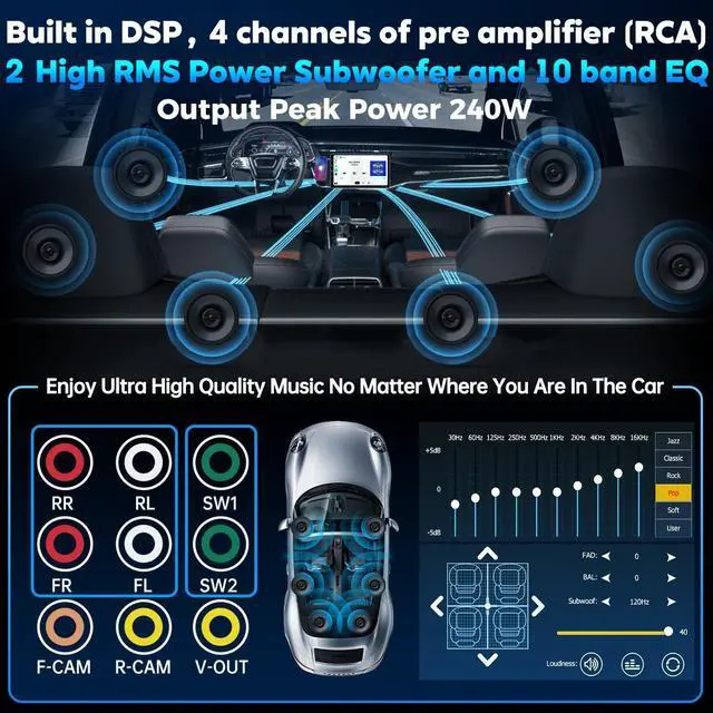 [Audiophile Sound Quality with Built-in DSP]: Immerse in audiophile-grade sound with a built-in DSP system, precisely tuned for perfection. The 10-band EQ lets sculpt the sound to preferences, 4.2 Channel pre amplifier output with peak power 60W*4(240W), 2 subwoofers deliver deep bass output for a resonating multimedia player experience.