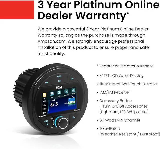 BOSS Audio Systems provides a powerful 3-year platinum online dealer warranty so long as the purchase is made through Amazon.com. We strongly encourage professional installation of this product to ensure proper and safe functionality