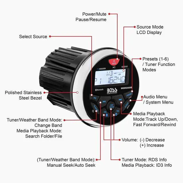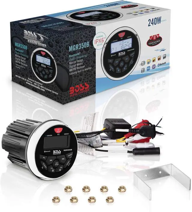 BOSS Audio Systems MGR350B Marine Boat Stereo Gauge Receiver Bluetooth Head Unit, No CD DVD Player, Built-in 4 Channel Amplifier, Weatherproof, USB, USB Charging
