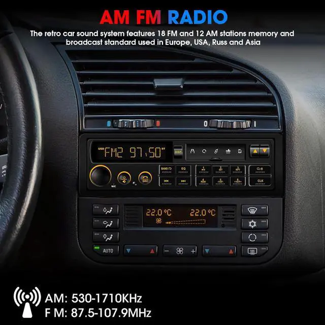 FM AM Tuner: This retro car sound system features 18 FM and 12 AM stations memory for real-time news, music, sports and broadcast standard used in Europe, USA, Russ and Asia
