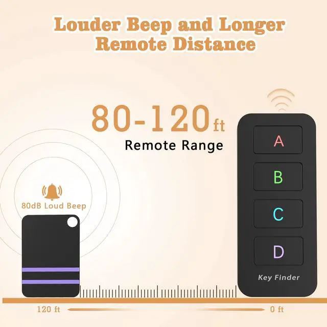 LOUD BEEPER, 120FT REMOTE DISTANCE With a loud beeping volume of up to 85dB, even those with hearing difficulties can easily locate lost items. The RF wave of the tracking device can penetrate through walls, floors, cushions, etc., aiding in tracking down items from up to 120 feet away (tested in an open area). This distance is adequate to cover an entire apartment, making it helpful for tracking lost keys, wallets, phones, glasses, and even pets.