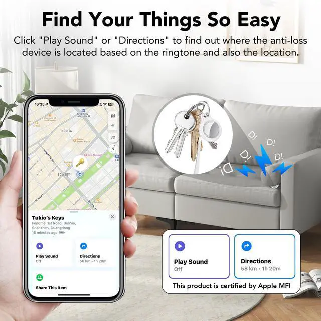 TRACK ANYWHERE: The tracker allows you to view your items' location in real-time. When within 200 feet, simply tap the "Find My" app, and the key finder locator with sound will emit an 80-100dB beep to help find your belongings. For distances greater than 200 feet, use the help of hundreds of millions of Apple devices in the "Find My" network.