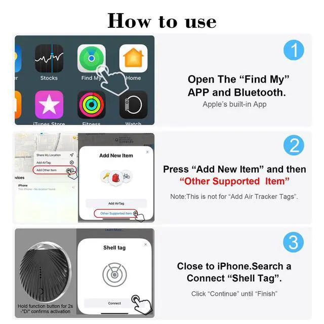 Find Nearby: Works with Apple "Find My" app to help find your stuff by ringing your luggage tags through the built-in speaker (loud ringing 100-120 decibels), or just ask Siri for help. If the tag is out of Bluetooth range, you can use the map navigation in 'Find My' to find the location of the item finder tag. (Note: This product only supports iOS devices, not Android)