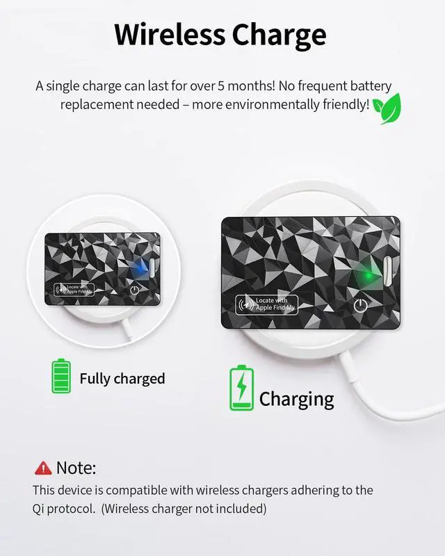 Rechargeable Smart Tag: Forgot to charge before your trip? 1 charge = 180 days active use, so you can skip frequent battery replacements. Perfect for trips and more eco-friendly by reducing waste. (Works with Qi wireless chargers)