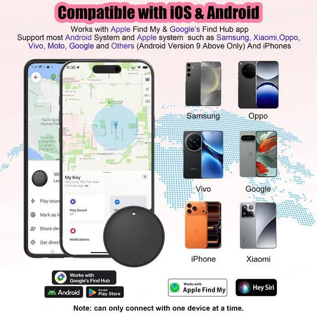 Dual-System Compatibility for Wide Use: Seamlessly works with both iOS and Android devices. It supports Apple's well-known Find My app (exclusive to iOS) and Google's Find Hub (for Android), eliminating the need to repurchase a tracker when switching phone systems. (Important Note: This tracker cannot connect to two devices simultaneously; it can only be paired with one device at a time.)
