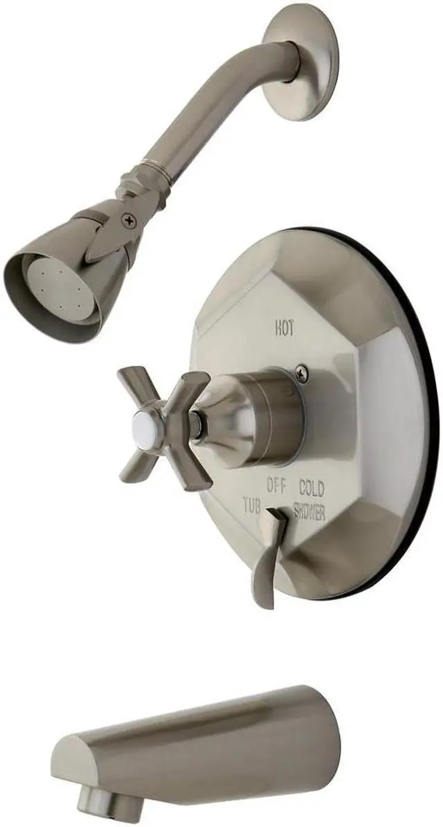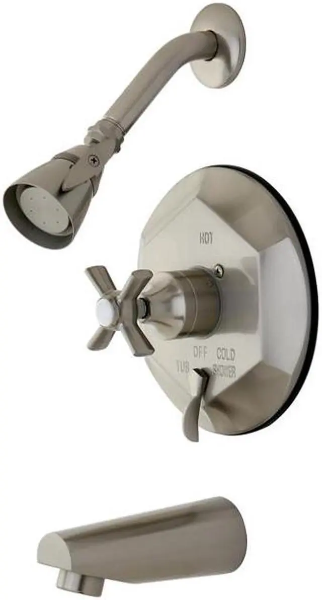 Kingston Brass Millennium Tub/Shower Faucet, Satin NickelThis pressure balance showerset with its faceted face plate and cylindrical escutcheon will work well with most contemporary and transitional decors, this valve features screwdriver stops and a built-in diverter. Pressure Balance Washerless CartridgeCast Brass Construction For DurabilityMin: 1", Max: 1-5/8" For installationSingle Hot & Cold HandleCollection/Series: MillenniumFinish: Satin NickelTheme: Modern