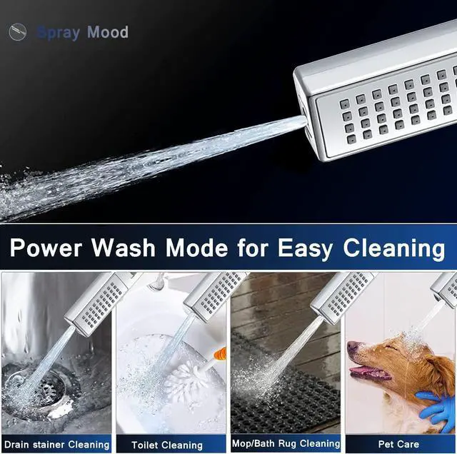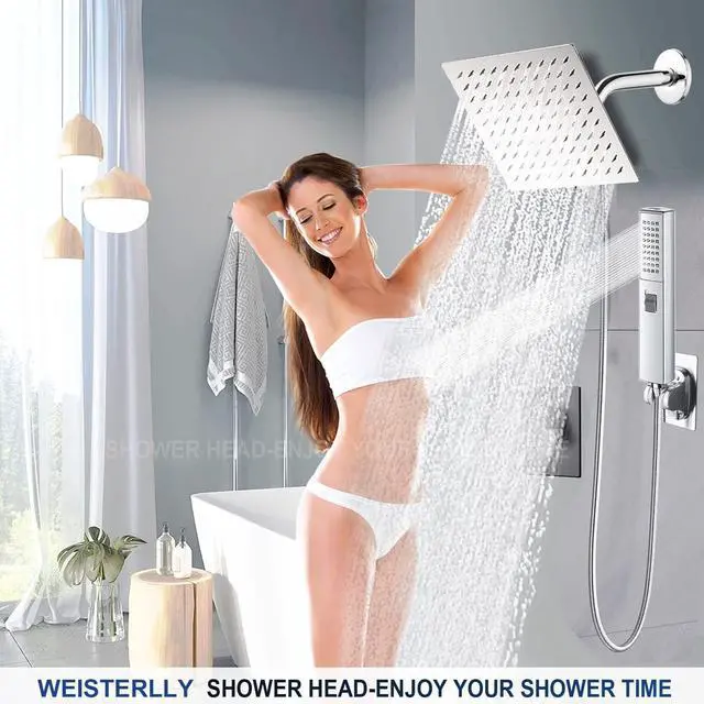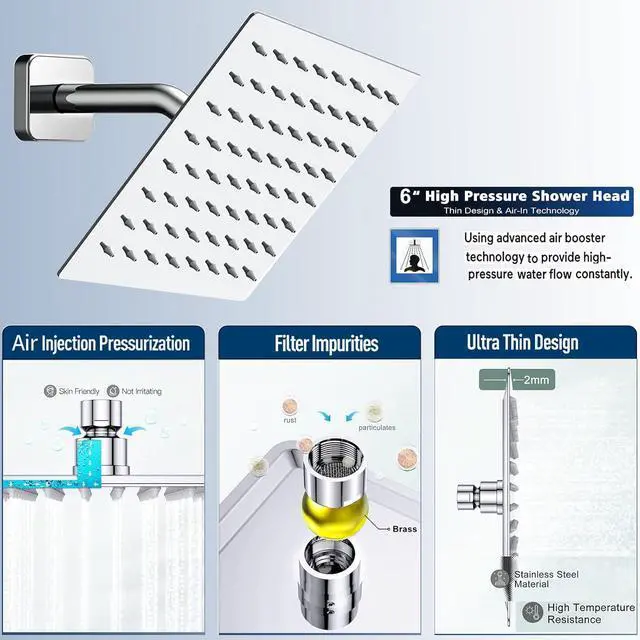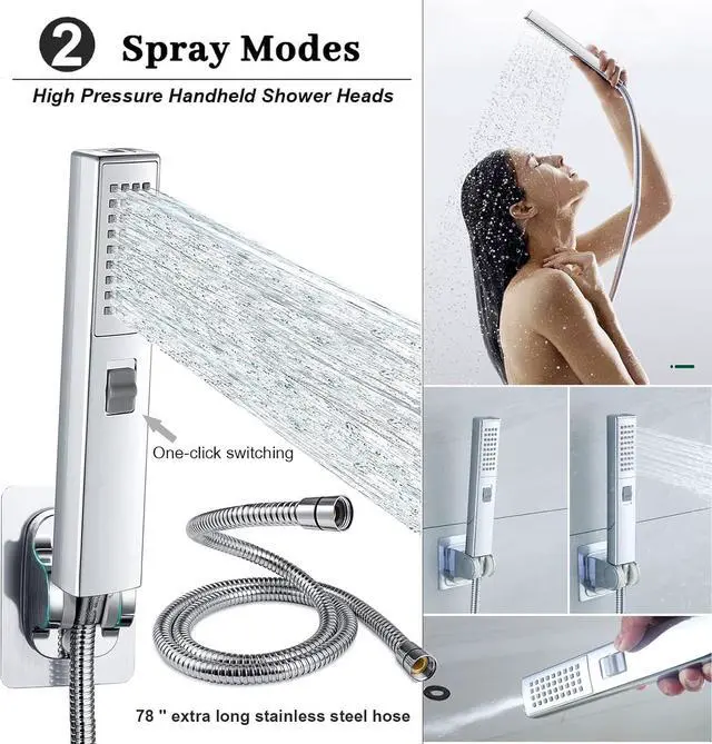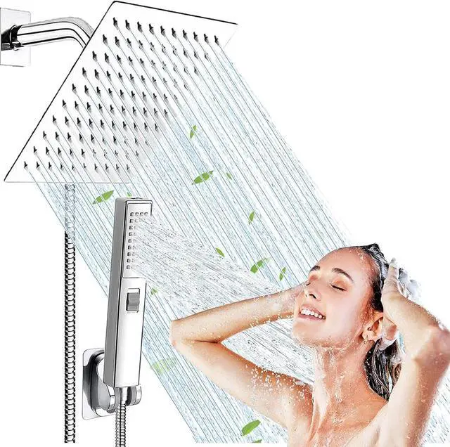 { Rain shower head } The 6 " square chrome shower head is made of high-quality stainless steel and is durable. It is equipped with a self-cleaning silicone nozzle to provide excellent water flow coverage. By rotating the brass ball, you can adjust and fix it to any desired angle to meet the shower needs of different locations. It will provide you with an excellent shower experience. { Handheld shower head - 2 settings } The two-in-one manual shower not only provides comfortable water flow during showering, but also allows you to switch to the spray gun mode with one click when manually pressing a button. It has a powerful injection function, and with it, you have the best assistant for cleaning the bathroom. You can use it to bathe your pets, clean the bathroom, and so on. { 78 " extra long hose } Our handheld shower head assembly comes with a 78 inch handheld shower hose. Metallic materials provide excellent flexibility and practicality, making them longer and easier to clean than other hand-held shower hoses. This has brought you great convenience. { Professional technology } Both the shower head and hand-held shower head combine ultra-thin and air sensing technology, optimized for water pressure, just like a comprehensive and dynamic massage of the skin. Can bring you a hotel style shower experience. Say goodbye to the bad experience of low water pressure. Suitable for multiple places such as families, apartments, hotels, etc { Easy to install } You don' t need to call the plumber to install it easily in a few minutes. Follow the instructions in the shower nozzle manual. You can do well! If you encounter any issues during the installation process, please contact us in a timely manner, and we will promptly resolve all issues for you.