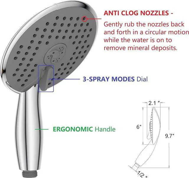 MATCHING 6-inch 3-spray modes SHOWERHEADS with BRASS BALLJOINT: Each shower head has 3-settings / MODERN DESIGN with high-pressure spray and ergonomic grip handle /