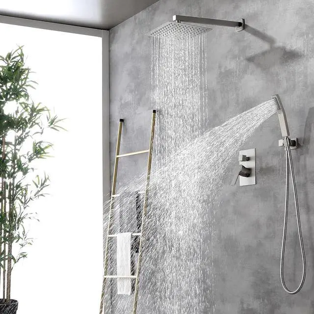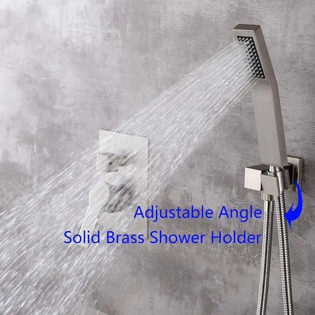 Our Premium Shower Faucet Set Including 10-Inch square fixed shower head (SUS304 Stainless steel), handheld shower head (Brass), 15.7 -Inch shower arm (Brass), 59-Inch shower hoseSUS304 Stainless steel), shower holder (Brass), shower mixer valve body (Brass) and other necessary installation parts