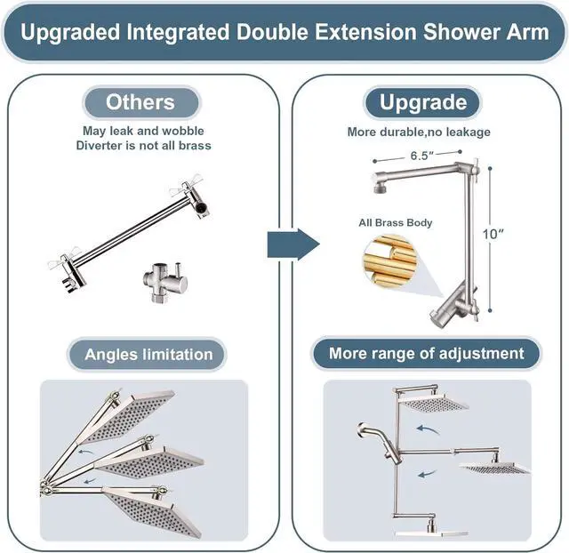 Enjoy a Rainfall Spa: The 16.5 -inch double extension arm allows you to easily adjust the rain shower' s height, creating a personalized, spa-like experience. Maintain a perfect, level position for a soothing, rainfall-style flow that enhances your relaxation every time