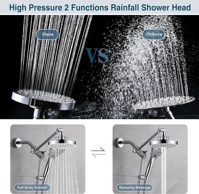 High Pressure 2 Spray Settings Rainfall Shower Head: Our showerhead provides powerful water pressure even in low water pressure conditions to help wash away soap, shampoo, and conditioner with less effort.