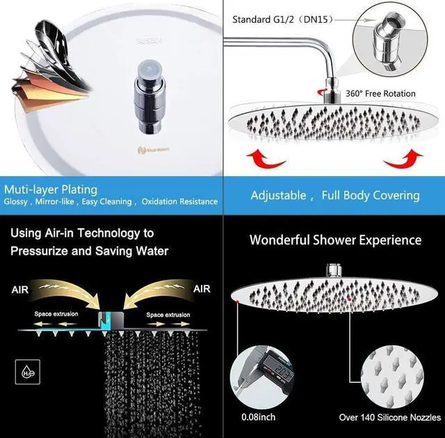 EXTRA LARGE AND POWERFUL: The 12 inch shower head contains over 140 nozzles with max high flow overhead. With the swivel ball connector, the shower head can be adjusted to any angle. Under this luxury shower head, you can enjoy a wonderful and gentle downpour that is flowing down over your full body. Massaging function as like doing natural SPA. It would be a peerless shower effect youd never experienced.