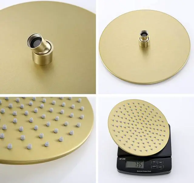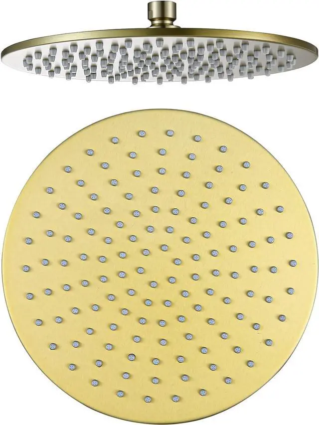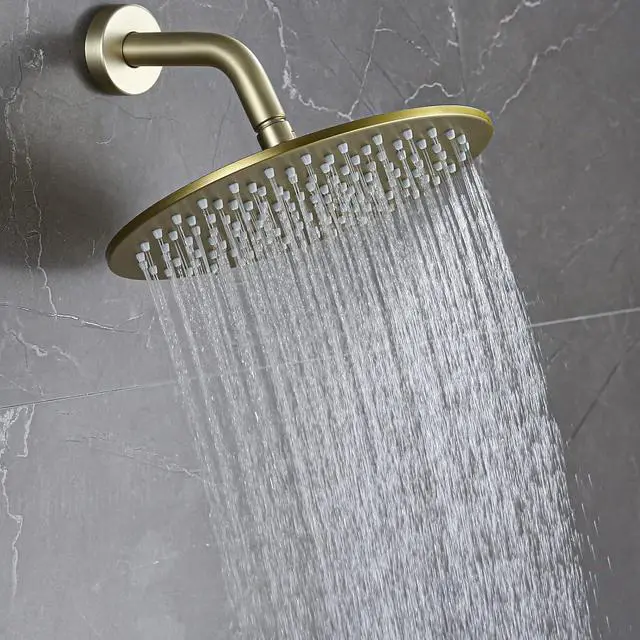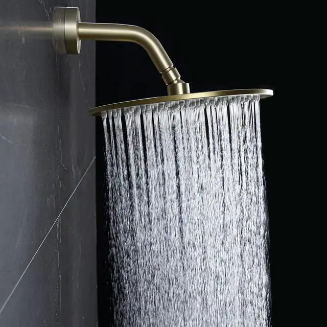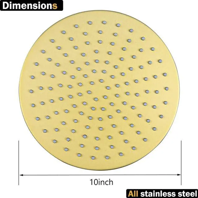LATEST TECHNOLOGY AND SHOWER HEAD PRO RANDOM 10 inches round designer rain shower head is 100% heavy duty solid stainless steel, durable with the highest rust resistance. The surface Brushed Gold finish makes the showerhead beautiful and awesome match with any bathroom decor. Using the latest surface treatment technology, resists water spots and fingerprints, LESS SPOTS LESS CLEANING MORE DURABLE.
