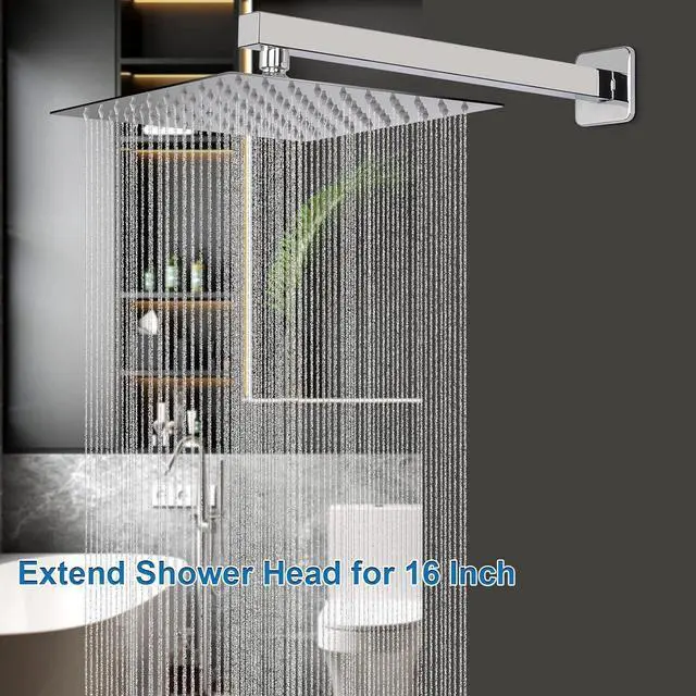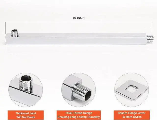 SQUARE SHOWER ARM: Standard U. S 1/2 NPT Tapered Threads. HarJue 16-inch shower arm providing large wall distance for a relaxing shower. Square shower head with square shower arm is more luxurious
