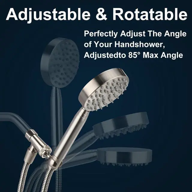 All Metal Shower Head Bracket Holder with universal pivot ball, you can perfectly adjust the angle of your handshower, Can be adjustedto 85° max angle, Easily rotate the shower holder 360 degrees to find your perfect handheld showerhead angle