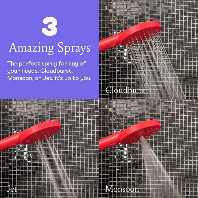 3 SPRAY FUNCTIONS AND A PAUSE BUTTON Choose from Monsoon for a strong rinse, Cloudburst for a soothing rain, or Jet for a firm massage. Use the pause button on the handheld to reduce flowgreat for saving water while bathing kids or washing pets.