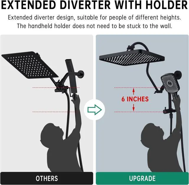 UNIQUE METAL EXTENDED DIVERTER WITH HOLDER: The unique metal extended diverter switch allows you to adjust the mode without having to lift your arm hard. The handheld shower holder does not need to be glued to the wall, it is convenient to reach the handheld device. G1/2 universal connection for most standard U. S. bathroom plumbing.