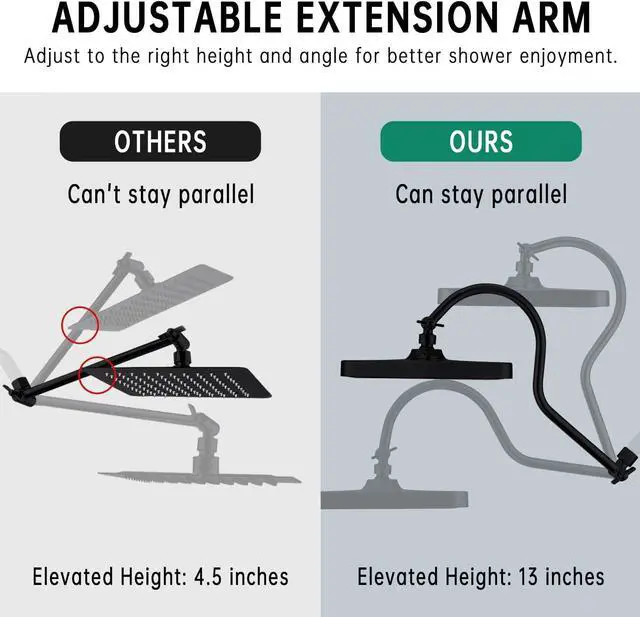 13 INCH CURVED ADJUSTABLE SHOWER ARM: The 13-inch curved adjustable shower arm can be adjusted in height and angle. The curved shower arm is designed to leave more room for the rainfall shower head, which can be adjusted at a greater angle without colliding with the shower arm. The extended shower arm remains perpendicular to the ground when raised to its highest position.