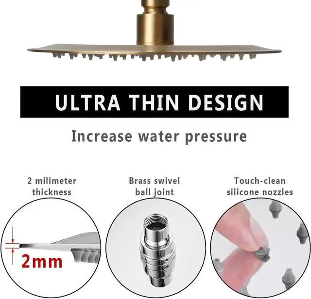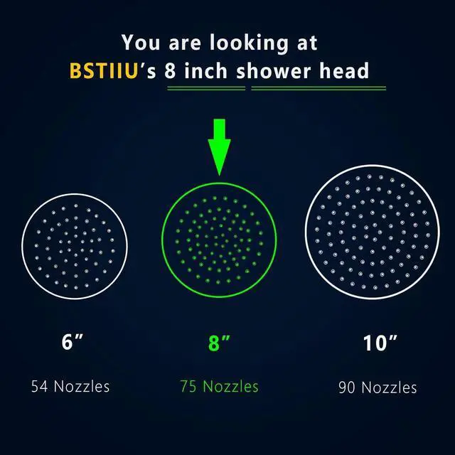 High Pressure Shower Heads: 8 " top shower panel to cover your whole body. The round shower head work great even under low water pressure, the combination of ultra-thin ( only 0.08 inch) and air-in technology leads to ultimate rainfall experience, which will save water for you.