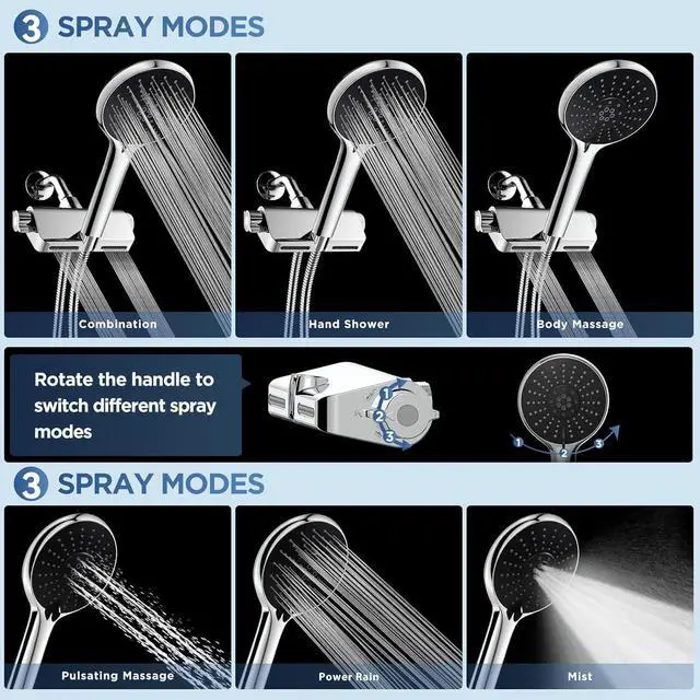 Muti-Functional Shower Head for Every Style: The knob on the side of the Body Massge 3-way Diverter can be turned to three different positions, activating the handshower, body massage or both. The handheld shower head has five spray modes: Pulsating Massage, Power Rain, Mist. Adjustable showerhead for a customized showering experience.