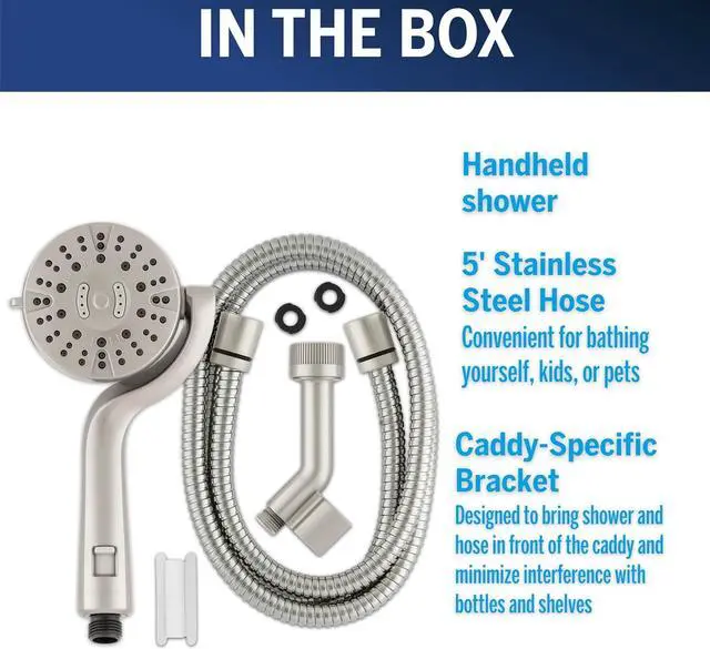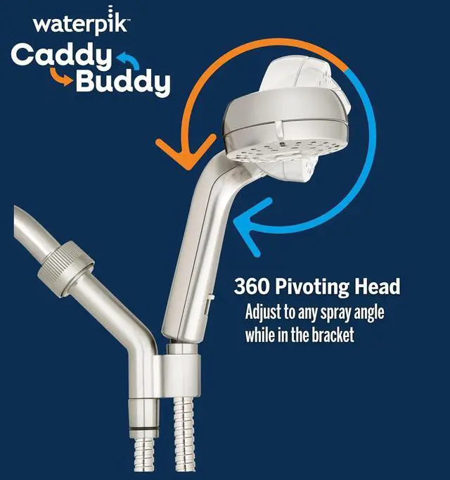 SHOWER CADDY COMPATIBLE: Waterpik Caddy Buddy shower head features a smartly designed bracket that brings the shower head and hose in front of the caddy, so it doesnt interfere with caddy storage; no more knocking over bottles or fighting the shower hose