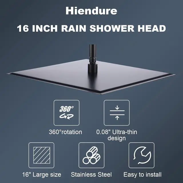 Large Size for Full Body Coverage: Extra large rainfall shower head, 16 by 16 inch, ultra-thin only 2 mm thick, 196 high pressure silicon nozzles. With the swivel ball connector you can adjust and fix it to any angle you like.