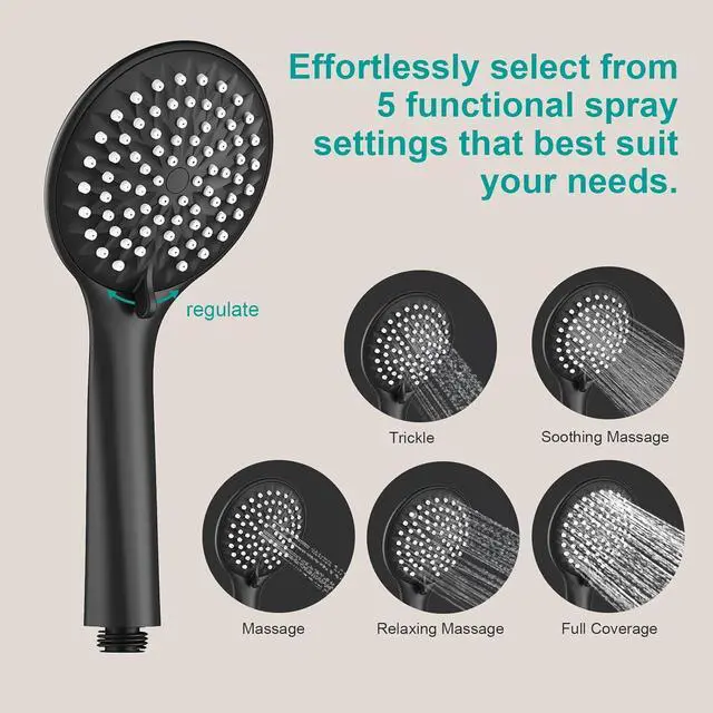 [Package Included] The package includes a 5-function handheld showerhead, a 59" (150cm) double interlock spiral hose, sliding bar, a shower holder, a hardware pack, and a detailed installation guide. It is designed for wall mounting installation.